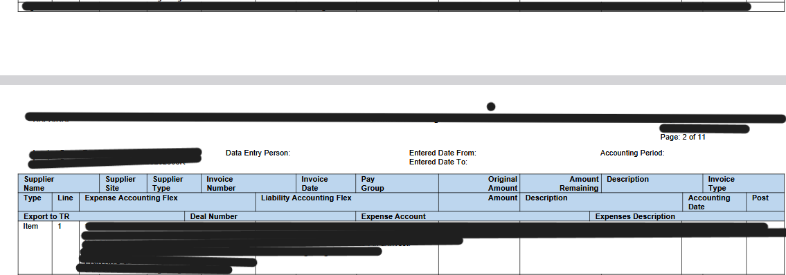 I have a custom report, it contains a table, show both the invoice header and invoice distribution information. But they are in separate rows.