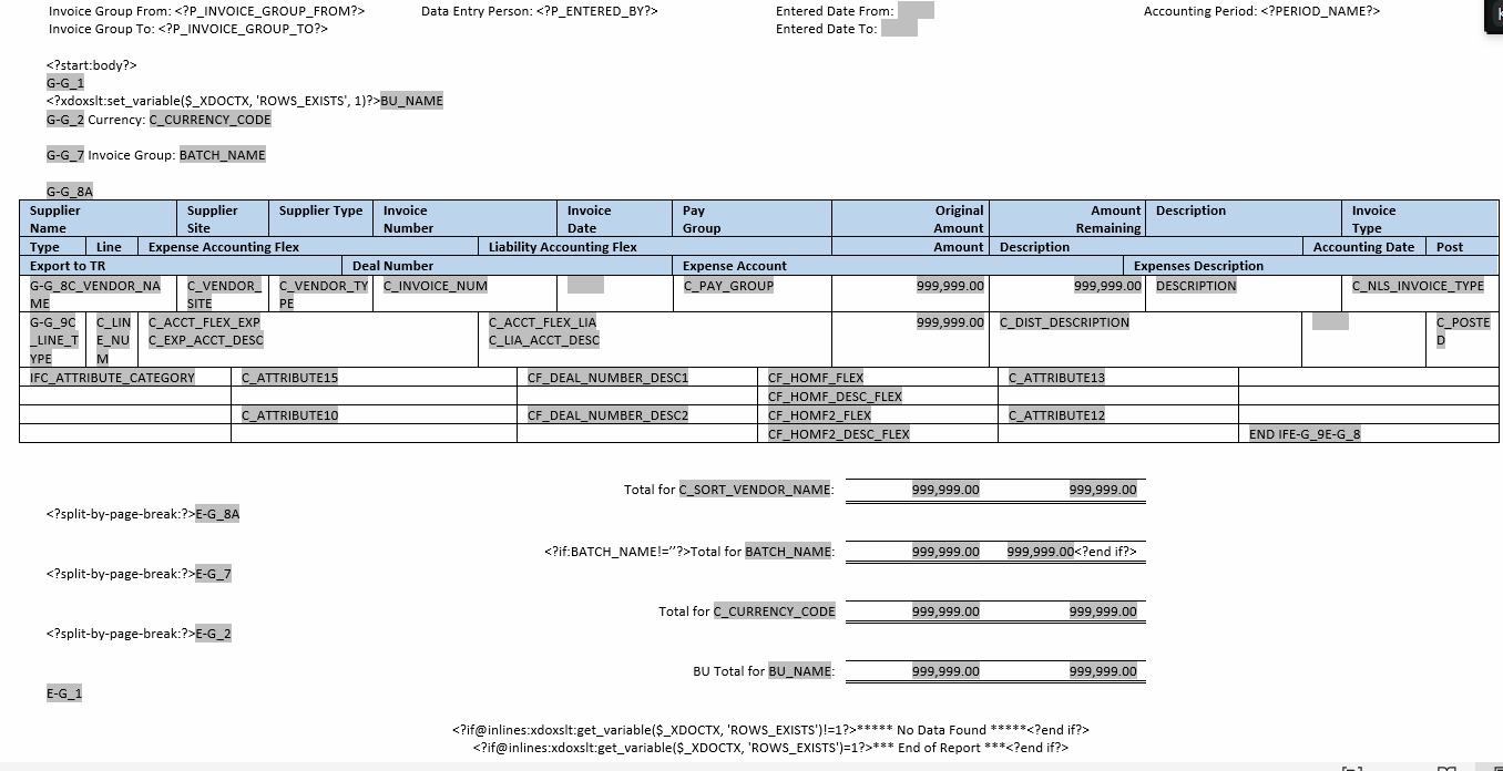 Above is the RTF template: Invoice Header row is in group 8, invoice distribution is in group 9.