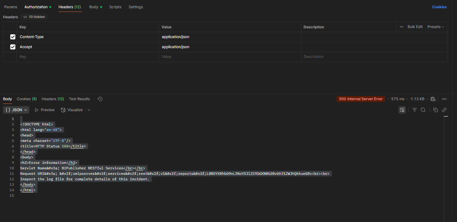 <!DOCTYPE html><html lang="en-US"><head><meta charset="UTF-8"/><title>HTTP Status 500</title></head><body><h2>Error information</h2>Servlet Name&#x3a; BIPublisher RESTful Services</br></br>Request URI&#x3a; &#x2f;xmlpserver&#x2f;services&#x2f;rest&#x2f;v1&#x2f;reports&#x2f;L0BDYXRhbG9nL3NoYXJlZC9DdXN0b20vUHJ1ZWJhQkkueGRv<br><br>Inspect the log file for complete details of this incident.</body></html>
