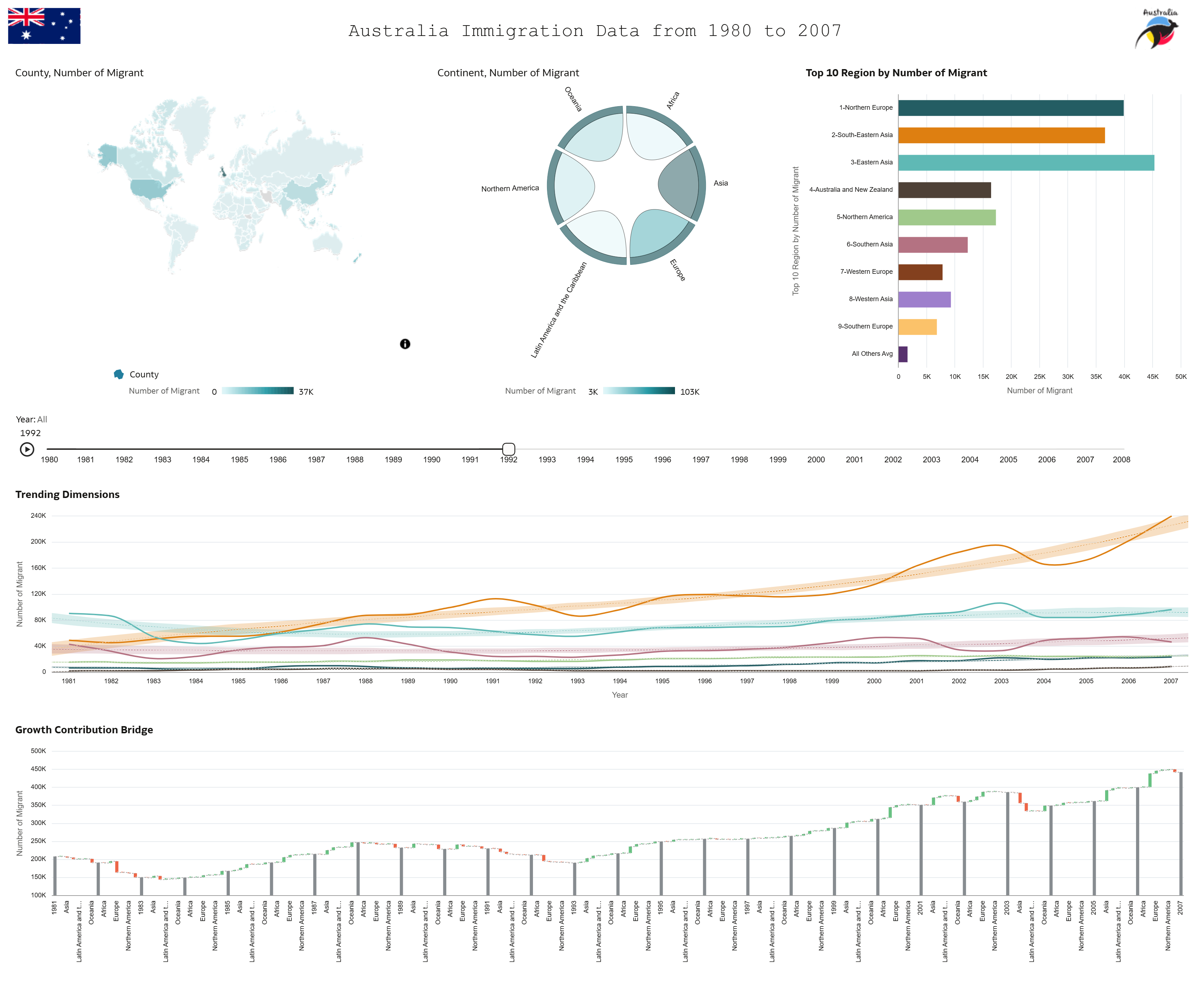 I wanted to create a simple but insightful dashboard that highlights how migration has changed from 1980 to 2007, including trends by country, region, and continent.