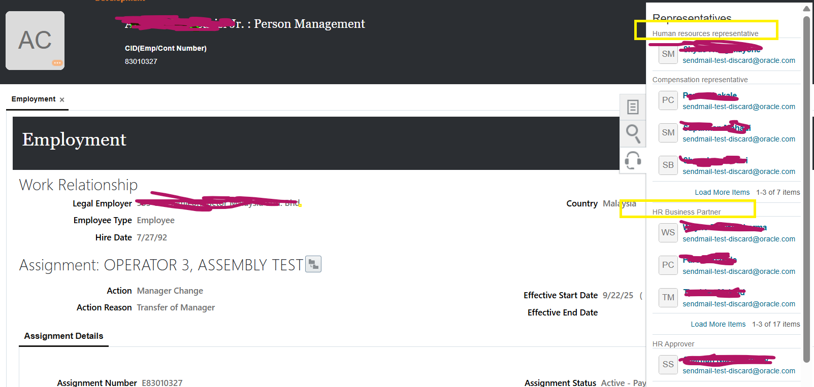 In person management when we search any person and click on Head phone icon we can see the all representative from where we need employee hrbp and hr rep .