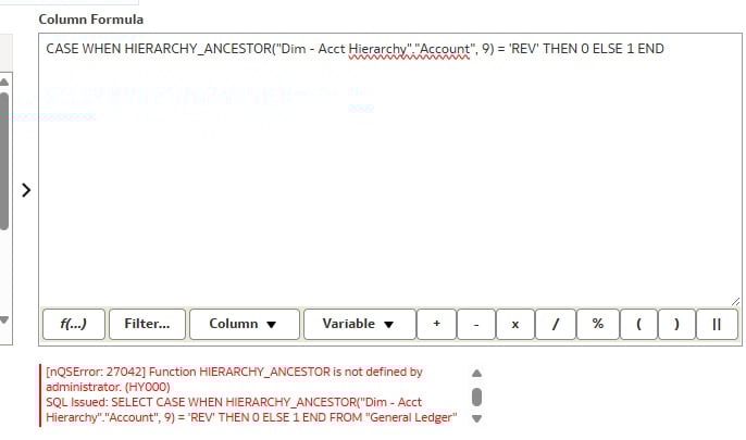 "TRIM" or "CAST" Trick Force the BI Server to evaluate the level value as a clean string. This is the most common fix for level-based columns that appear to "ignore" logic:• CASE WHEN TRIM("Parent Account 9") WHEN 'REV' THEN 1 ...