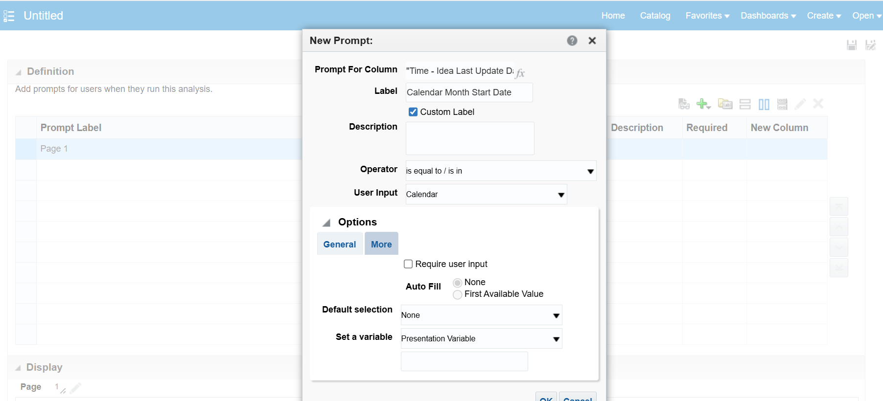 - Go to Fusion → Tools → Reports and Analytics → Browse Catalog → New → Dashboard Prompt.