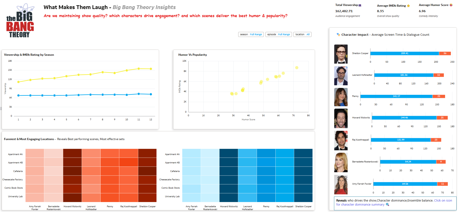 This dashboard presents a comprehensive analytical view of the popularity and success drivers of The Big Bang Theory. It visualizes trends in viewership and audience ratings across seasons, highlights character contributions to screen presence, humor, and engagement, and identifies scenes and locations that generate the highest audience response. The dashboard also explores the relationship between humor, character involvement, and episode popularity, enabling users to uncover meaningful correlations and patterns. Overall, it provides data-driven insights into the elements that shape a successful sitcom, supporting deeper understanding of storytelling dynamics, character impact, and audience behavior.