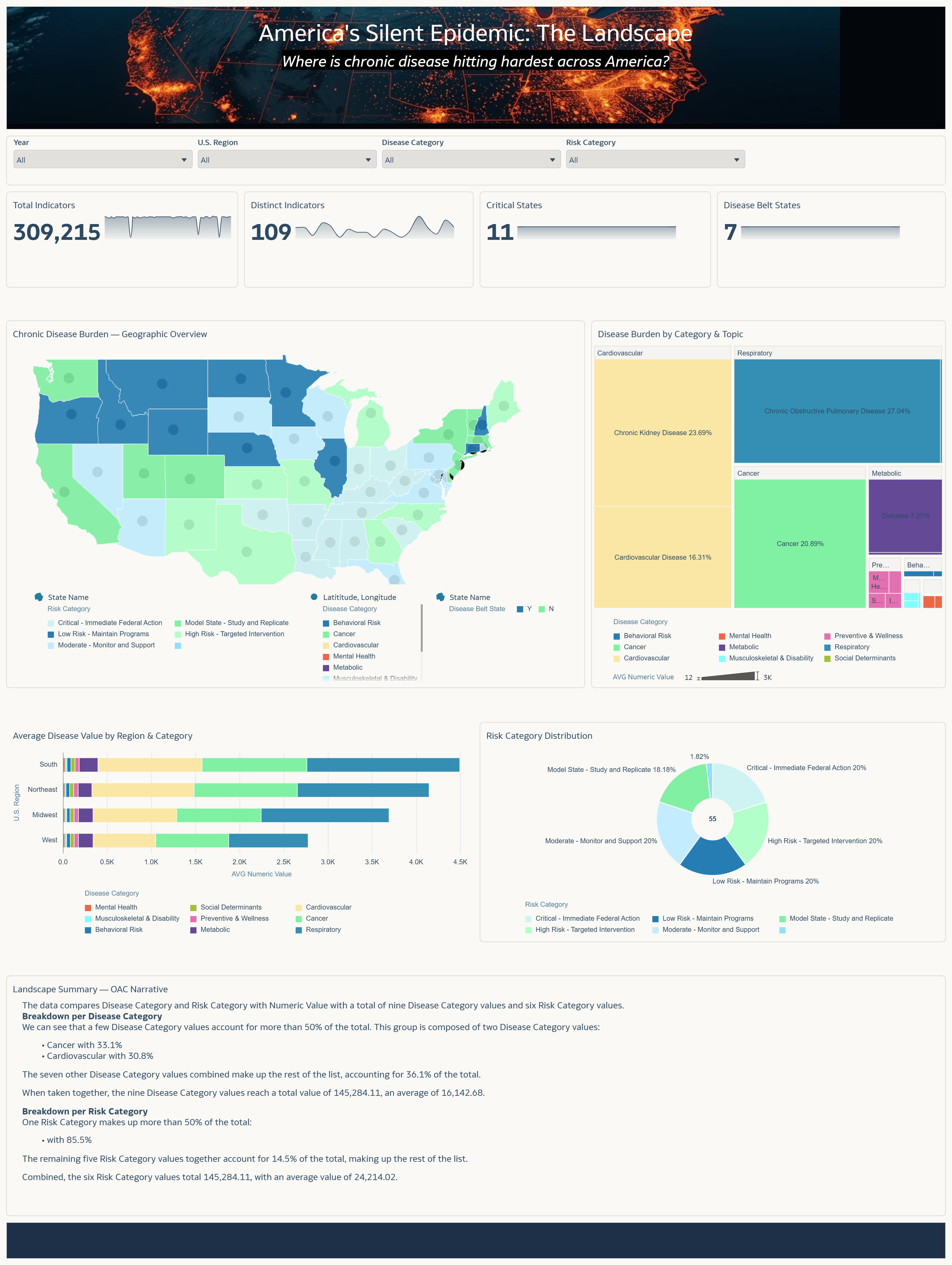"America's Silent Epidemic" is a three-canvas dashboard exploring U.S. chronic disease patterns across all states. It maps where disease hits hardest, exposes who bears the greatest burden, and forecasts what comes next — so policymakers can prioritize intervention.