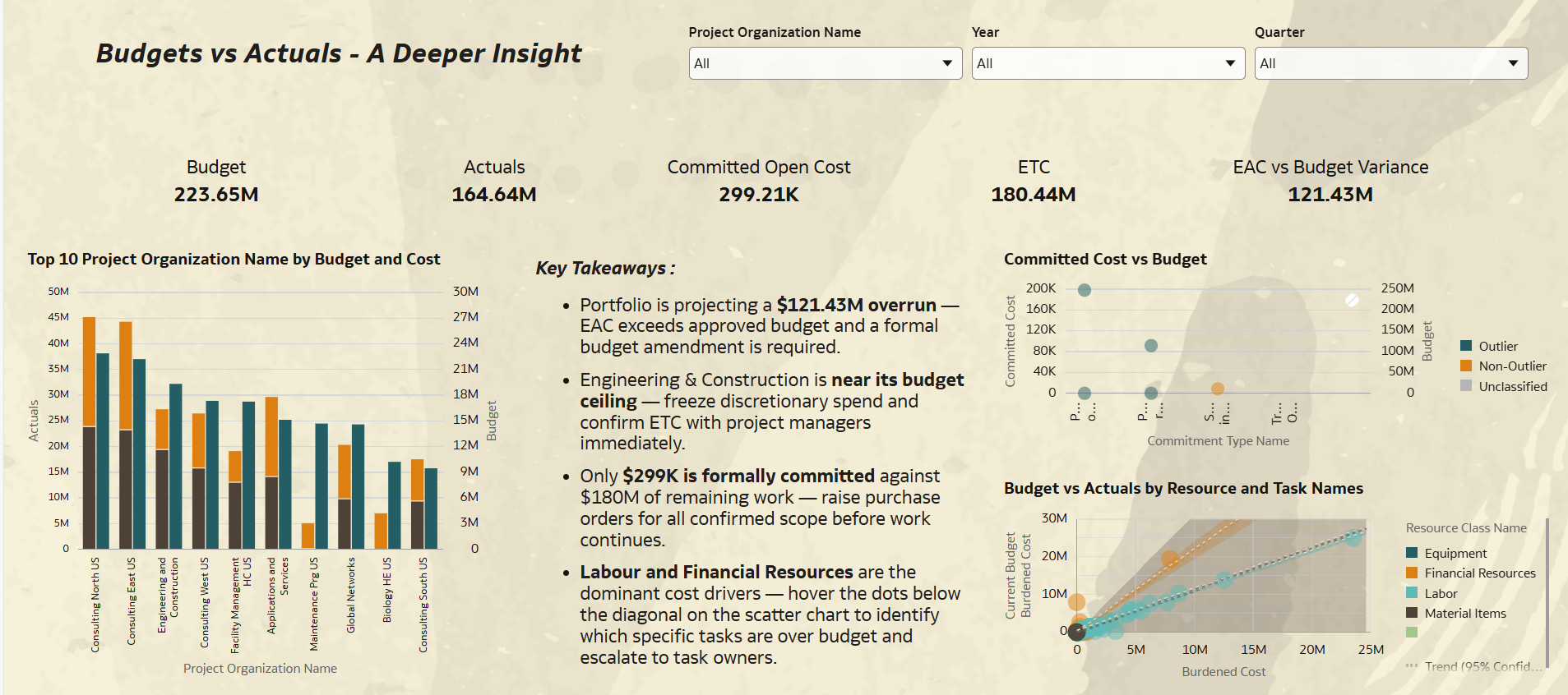 The dashboards answer one core question: "Is our project portfolio delivering within its approved budget, and where are the risks?" The Portfolio Overview page gives the headline financial position. The Budgets vs Actuals page breaks this down by organization, commitment type, and resource class to identify where the overrun is originating, which organizations are near their budget ceiling, and which cost types are driving overspend.