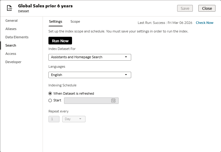 We are getting the "Not available due to errors" in the Assistant tab in a workbook. If I run the search manually it will refresh. I have tried leaving the the re-crawl on the refresh of the dataset. I have also scheduled the the crawl to refresh automatically and neither will work unless I process the search manually.