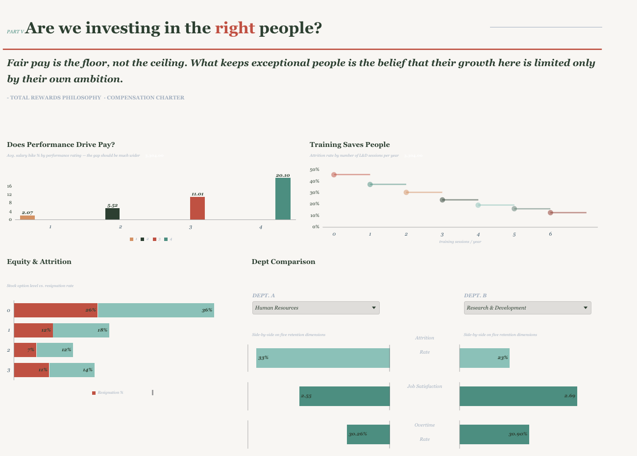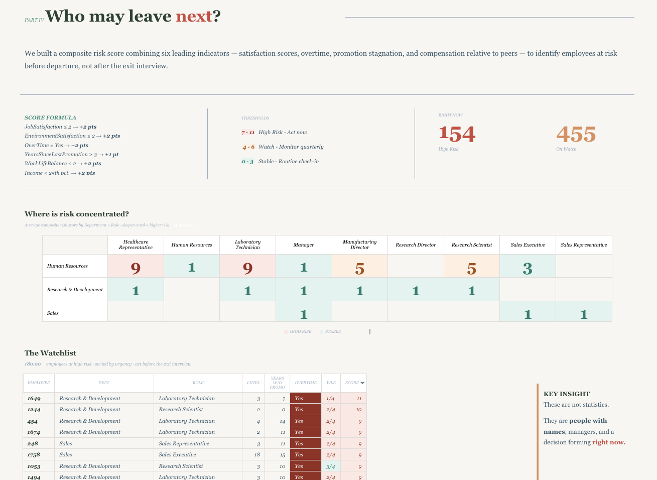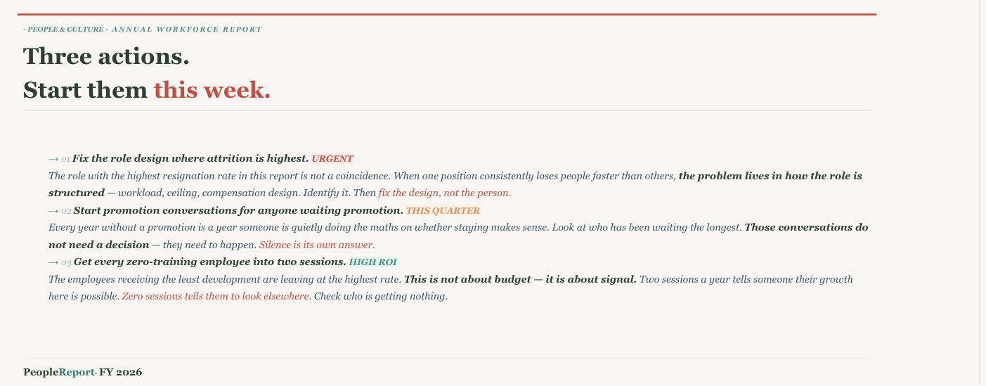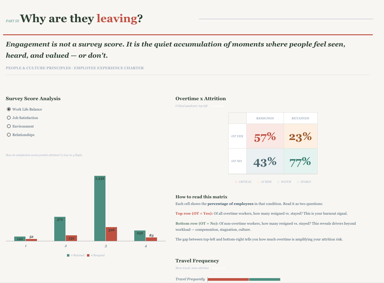 The primary audience is the Chief People Officer or HR Director — a senior leader who needs to make decisions, not explore data. The design reflects that. Rather than presenting an analytical grid of charts, the report is built as a living one-pager: a single, scrollable document with an editorial voice that guides the reader from what is happening, to why it is happening, to who is at risk, to what to do about it. Typography, hierarchy, and narrative text are used deliberately — every section opens with a question the CPO would actually ask, and every chart is accompanied by interpretive prose that tells the reader what to see and why it matters. The goal was to make the data feel like it is talking to you, not waiting for you to interrogate it.