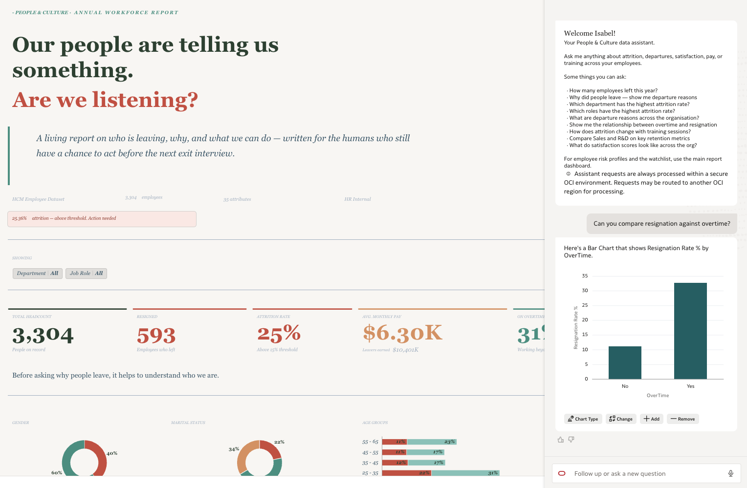 Analysis began inside Oracle Analytics using Insights and Explain on the key attrition fields, which surfaced the most statistically significant drivers and flagged where distributions looked structurally off. Those findings were then taken into an external AI to identify the KPIs and narrative threads most likely to resonate with a Chief People Officer — not just what was significant, but what was actionable and story-worthy. This two-stage approach — OAC for data-grounded discovery, AI for narrative shaping — produced a tighter set of questions that the dashboard is explicitly built to answer.