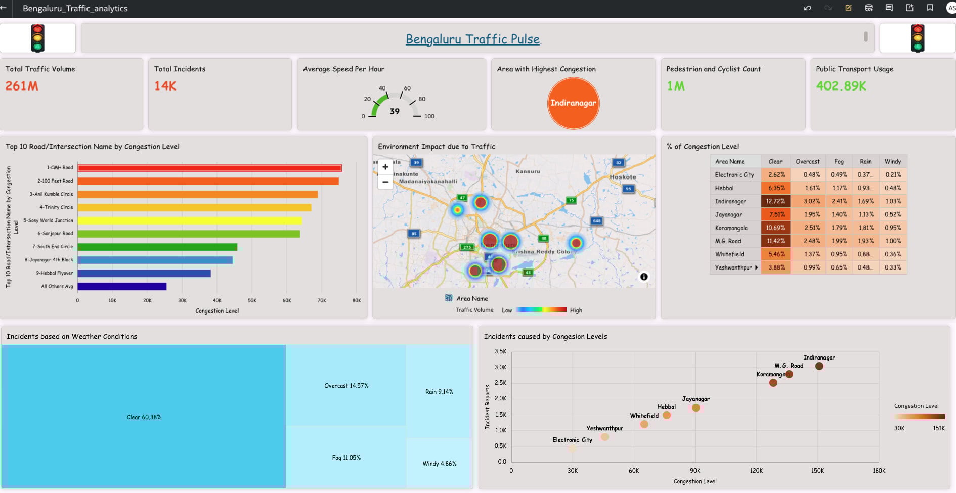 This Data Visualization captures detailed traffic patterns across major roads and intersections in Bangalore. It includes metrics such as traffic volume, speed, congestion levels, and environmental impact, providing a comprehensive view of the city's transportation dynamics..