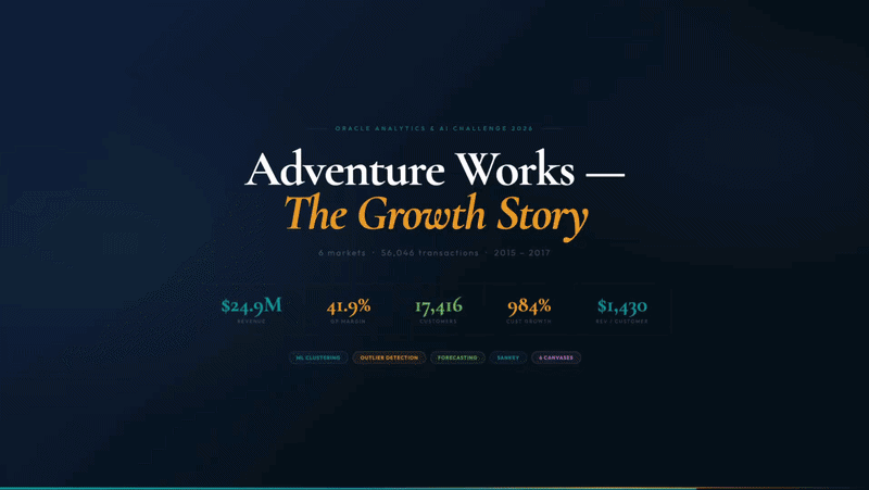 Product Performance:- OAC ML Clustering identifies four distinct product segments automatically. Mountain-200 dominates at $7.1M revenue. The surprise — Accessories post the highest gross profit margins in the entire catalogue despite the lowest ticket size.