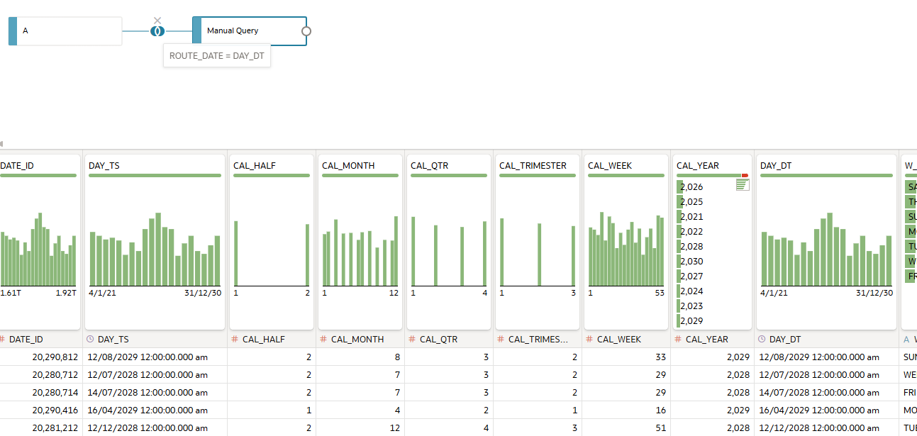 In an effort to replace the Excel file, in a Dataset we have identified a "Time" table from our ADW instance and linked it with a Full Outer Join to the Activity table, but the result is the same as above.