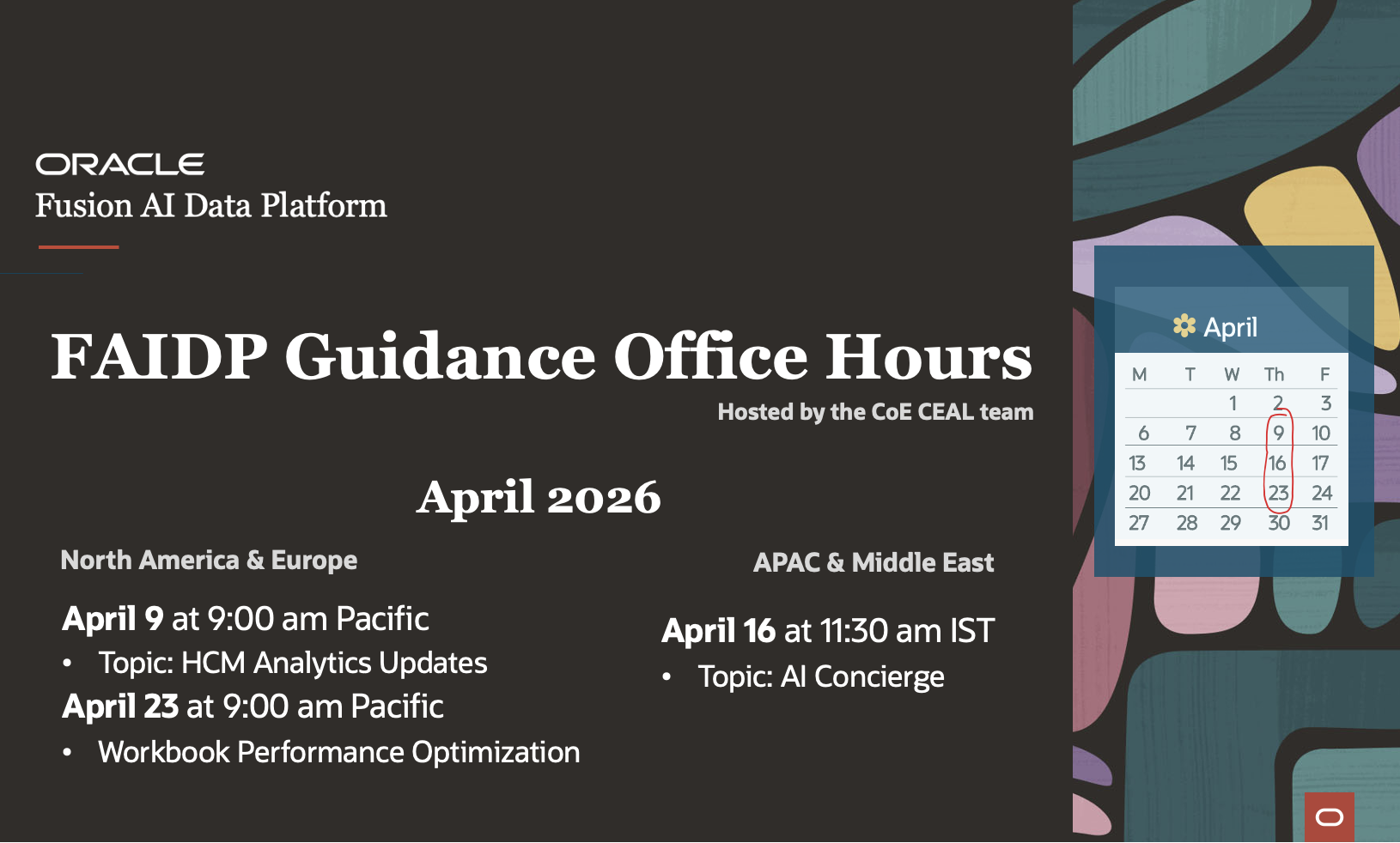 Oracle FAIDP Office Hours | April Schedule: HCM Analytics Updates & Optimize Workbook Performance