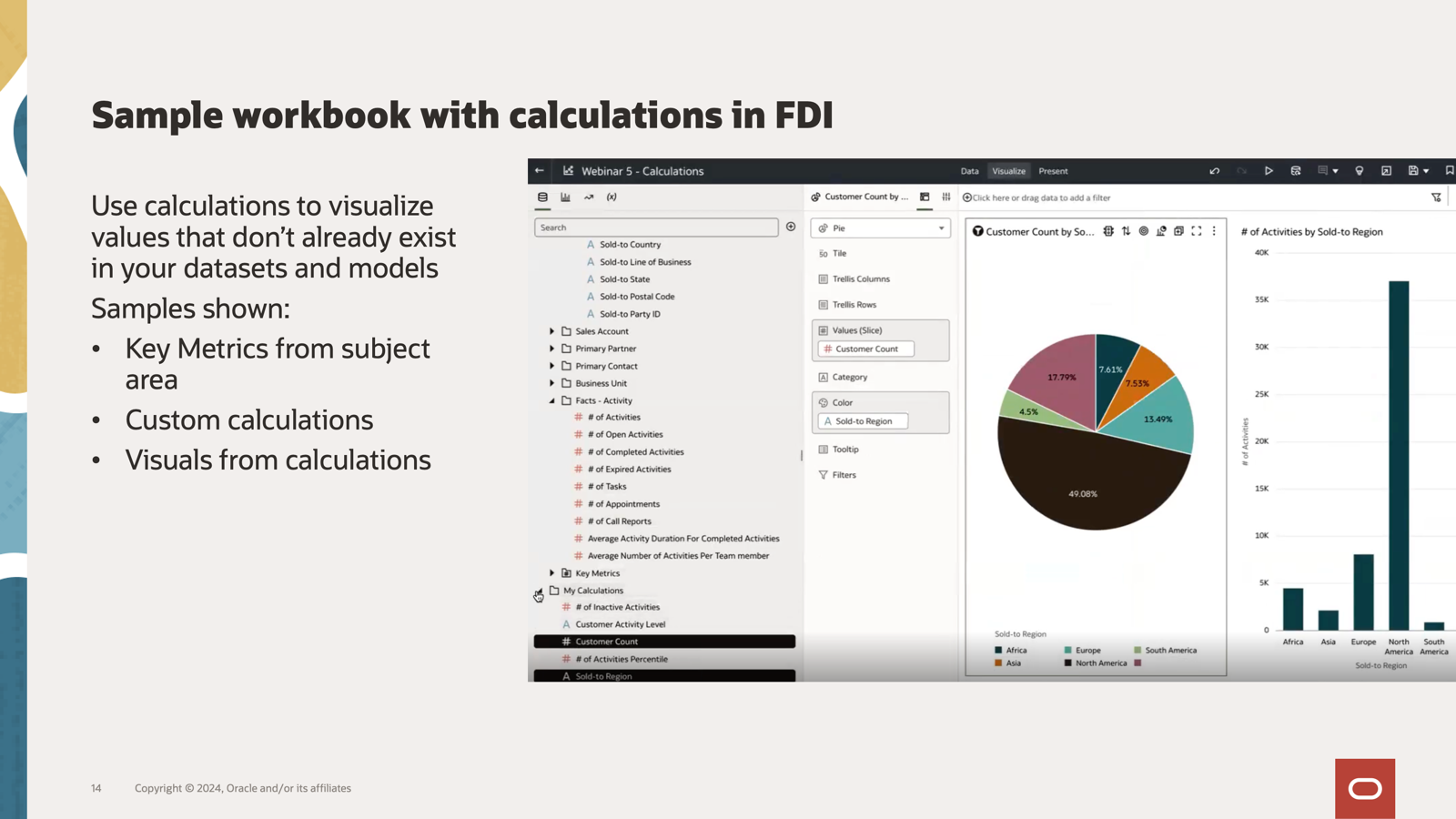 Using custom calculations Fusion Data Intelligence (FDI) helps you answer specific business questions about your data and accelerate decision-making. You will learn how to build custom calculations to generate custom metrics from your data to enhance your reporting. This is an intermediate session for business analysts learning FDI or those looking to hone their skills.